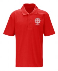 Red PE Polo top embroidered with school logo- Plain loose-fitting navy-blue shorts